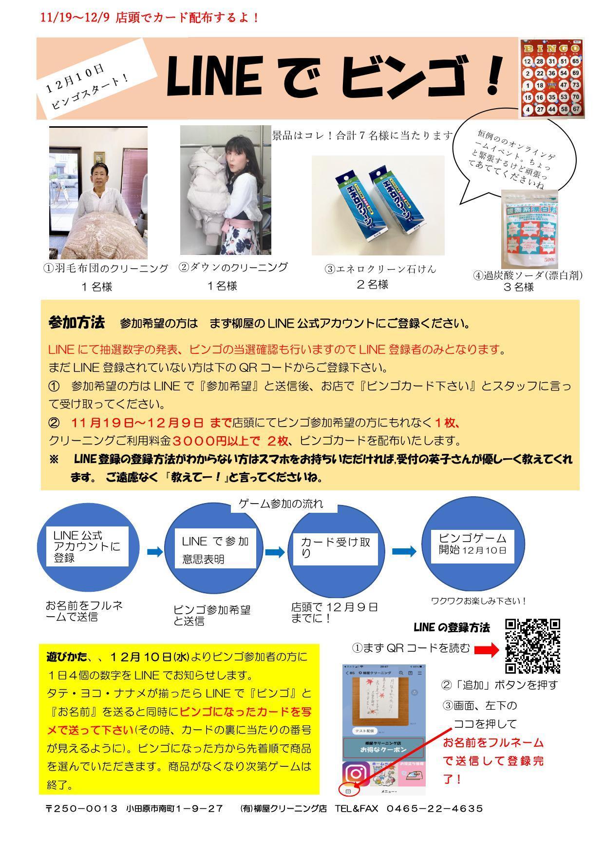 ②11/19〜12/9 柳屋クリーニング店頭で ビンゴカードを受け取る。