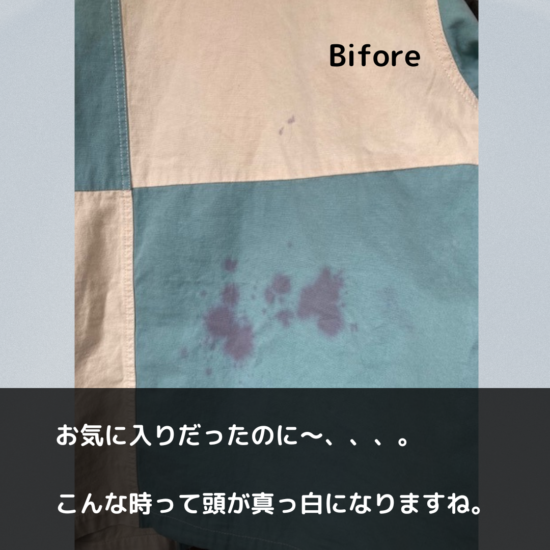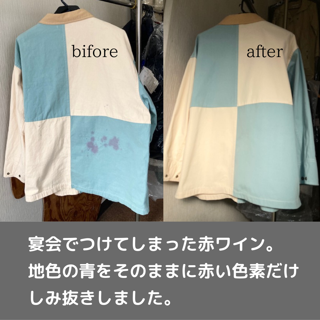 ★重要、、、ところが、受付で【お酒のシミであることを伝えない】とクリーニング店は1、のドライだけで済ませることがほとんど。だから【水溶性のお酒】が残ってしまうのです。